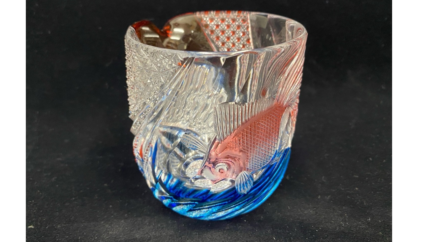 被せガラス(たとえば琥珀被せ・青被せ)やクリスタル質硝子が使用されており、金魚モチーフの部分において色ガラス・被せ・カット・彫刻の一連加工が明瞭であるかを確認しました。鱗ひとつひとつのカットの冴えや金魚の輪郭・水流文様の構成が精美であることが、価値を押し上げる重要な要素です。