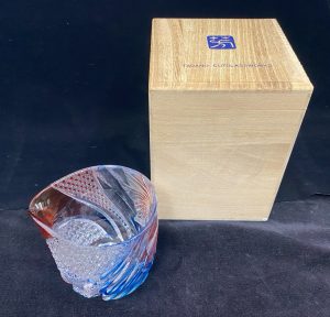 本体に欠け・ヒビ・変色・カット面の摩耗がないか、また元箱・証明書・木箱・鈍色の布袋など付属品が揃っているかを確認しました。特に切子作品ではカット面の摩耗・ガラス内部のクラックが保存価値を大きく左右します。