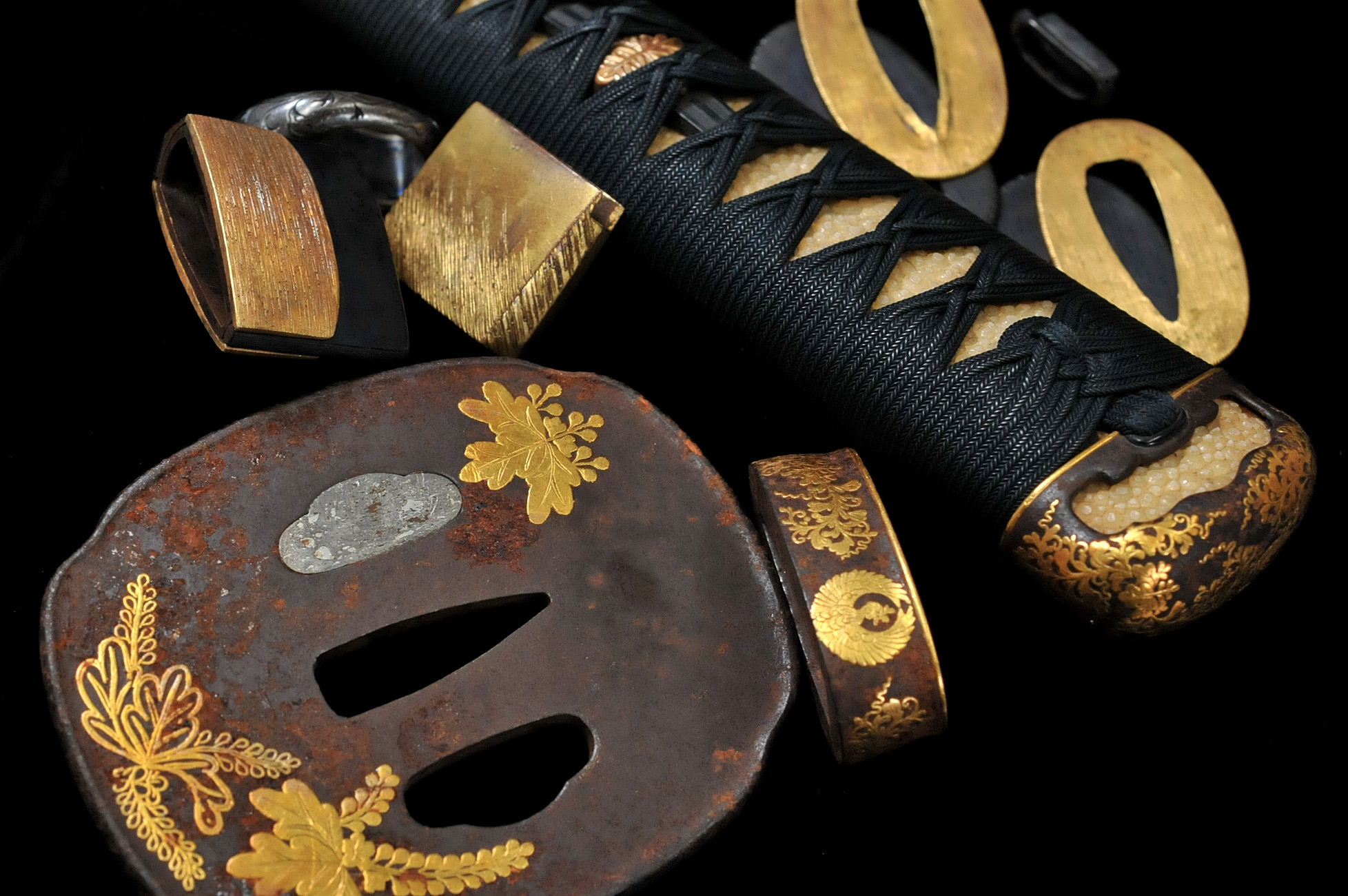 調和の美:三所物と縁頭が同一の意匠、同の作者の手による場合は「五所物」(いつところもの)と呼ばれ、珍重されました。統一された世界観で作られた刀装具一式の調和美は格別です。