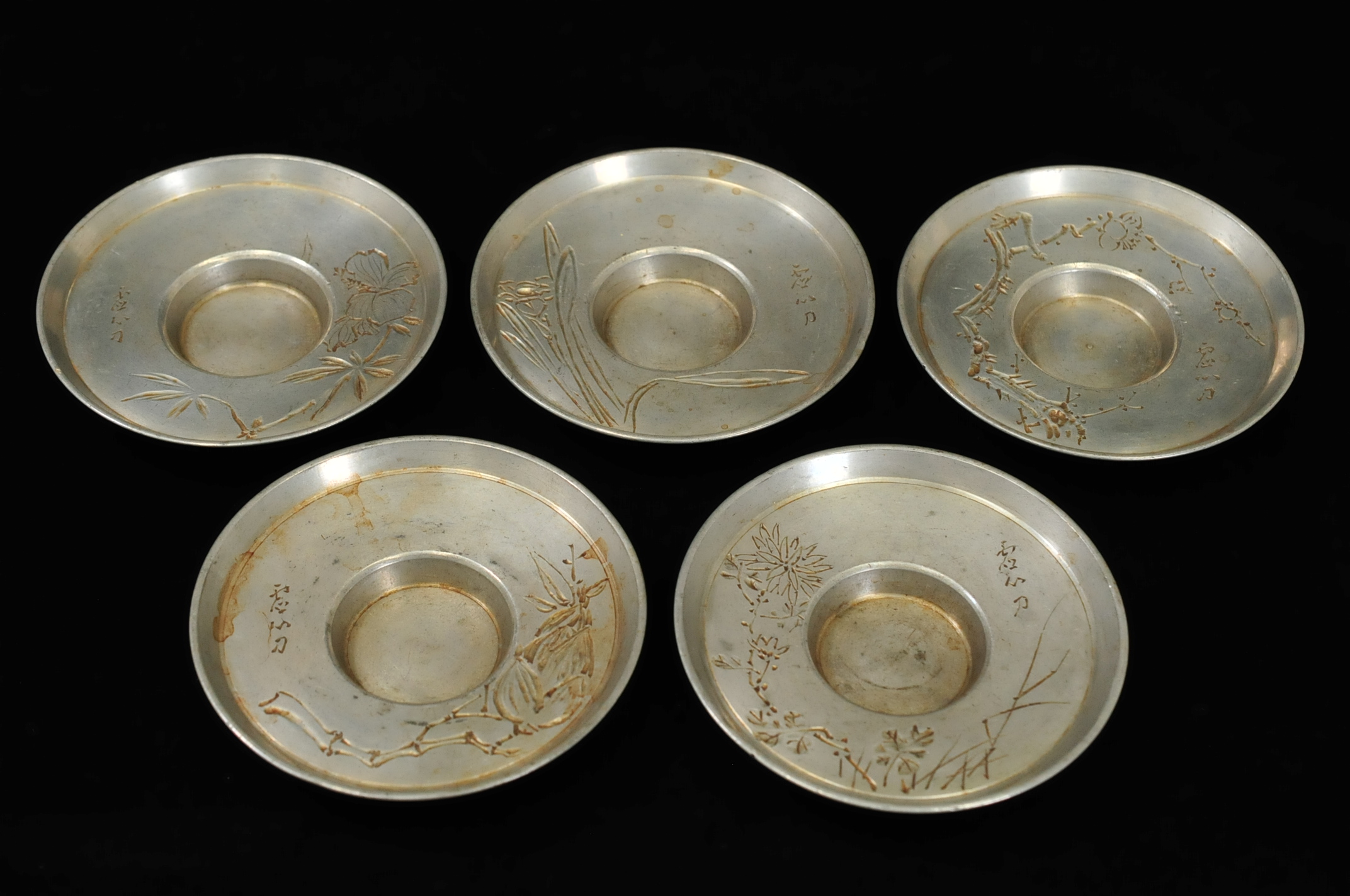 金属製茶托の主要な技法には以下があります。打ち出し技法では、金属板を木槌で叩いて立体的な文様を作り出します。彫金技法では、タガネという工具を使って精密な線彫りや浮き彫りを施します。象嵌技法では、異なる金属を嵌め込んで美しいコントラストを生み出します。